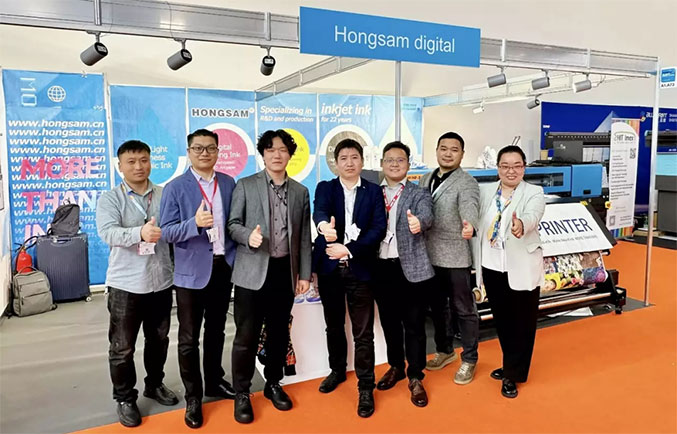 與其他品牌相比,鴻捷水性環保乳膠方案在多介質應用、打印效果以及性價比方面擁有顯著的優勢,深受歐洲客戶的歡迎。展會期間,甚至有多家同行朋友蒞臨鴻盛展位進行技術交流,對鴻捷水性乳膠方案表示了極大的興趣和認可。