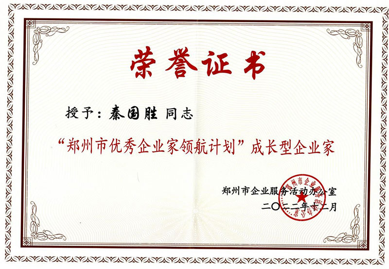 有家國情懷,志存高遠;持續(xù)學習,行業(yè)翹楚;上擔責任,下愛員工;領航一個行業(yè),帶動一方經(jīng)濟;領導一個企業(yè),成長一批人才。秦國勝先生被評為“鄭州市優(yōu)秀企業(yè)家領航計劃成長型企業(yè)家”,實至名歸。