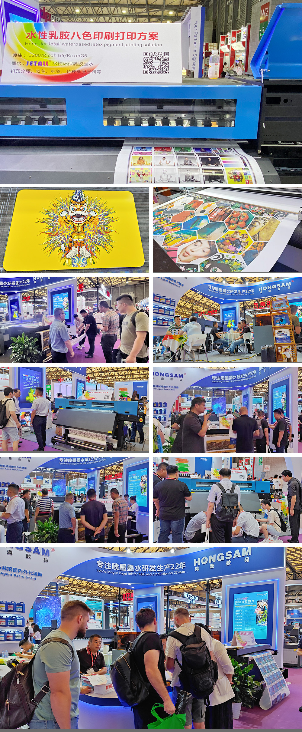 本次上海國(guó)際廣告展匯聚了全球的廣告行業(yè)精英,共同探討廣告領(lǐng)域的最新技術(shù)和產(chǎn)品。鴻盛數(shù)碼展示的JETALL®水性環(huán)保乳膠墨水打印方案吸引了眾多觀眾駐足參觀,現(xiàn)場(chǎng)演示了金屬、皮革、杜邦紙等不同材質(zhì)的打印方案,通過現(xiàn)場(chǎng)演示,觀眾們直觀地感受到了JETALL®水性環(huán)保乳膠墨水出色的打印效果,紛紛對(duì)我們的產(chǎn)品贊不絕口。