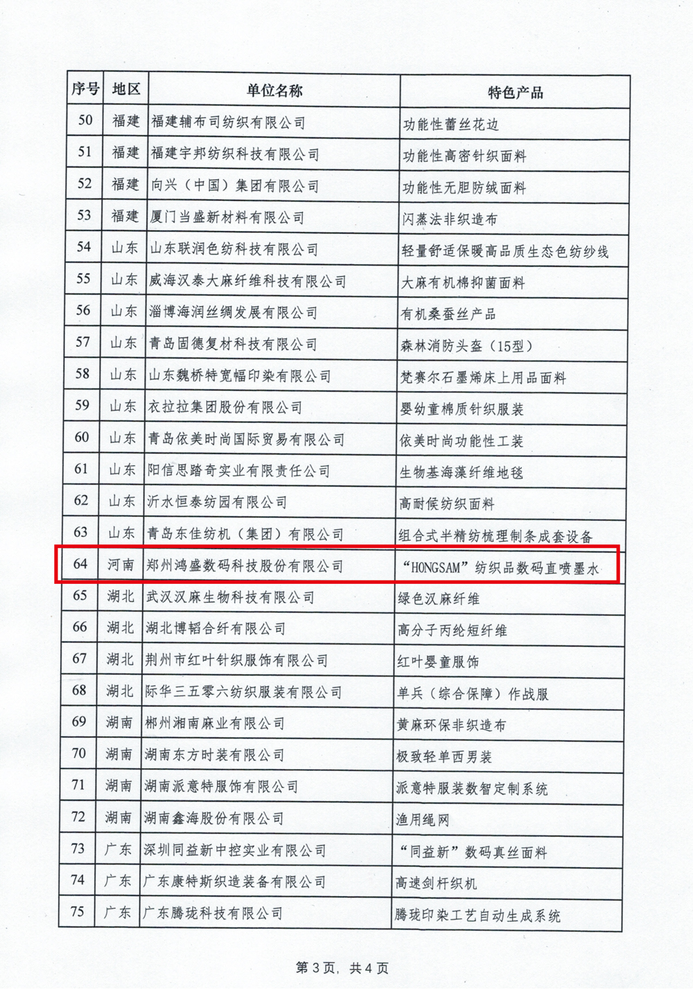 為貫徹落實習近平總書記關于“培育一批‘專精特新’中小企業”、提升中小企業創新能力的重要指示精神,貫徹落實黨的二十大精神,中國紡織工業聯合會繼續開展了紡織行業專精特新企業培育入庫工作。2023年上半年開始,經過企業申報和協會推薦、實地考察、審核等程序,確定了紡織行業專精特新企業(第四批)和第一批專精特新企業復核通過名單,本次第四批新認定“專精特新”企業,全國共81家,鴻盛數碼是其中之一,也是河南省唯一的一家。