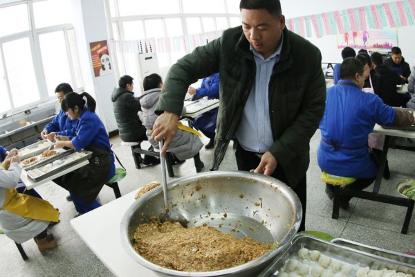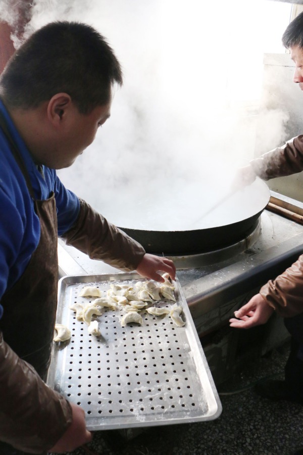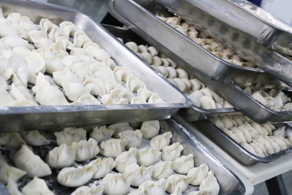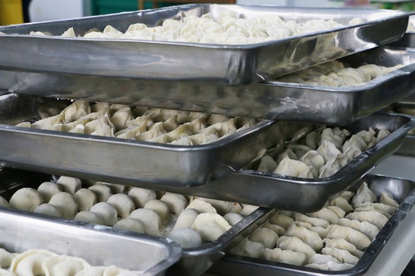 12月22日一大早, 鴻盛餐廳熱鬧開了——餐廳師傅調(diào)餡、和面, 各路人馬搟皮的搟皮、包餃子的包餃子,還有專人負(fù)責(zé)運(yùn)輸——補(bǔ)給皮兒、餡兒,騰挪包好的餃子。