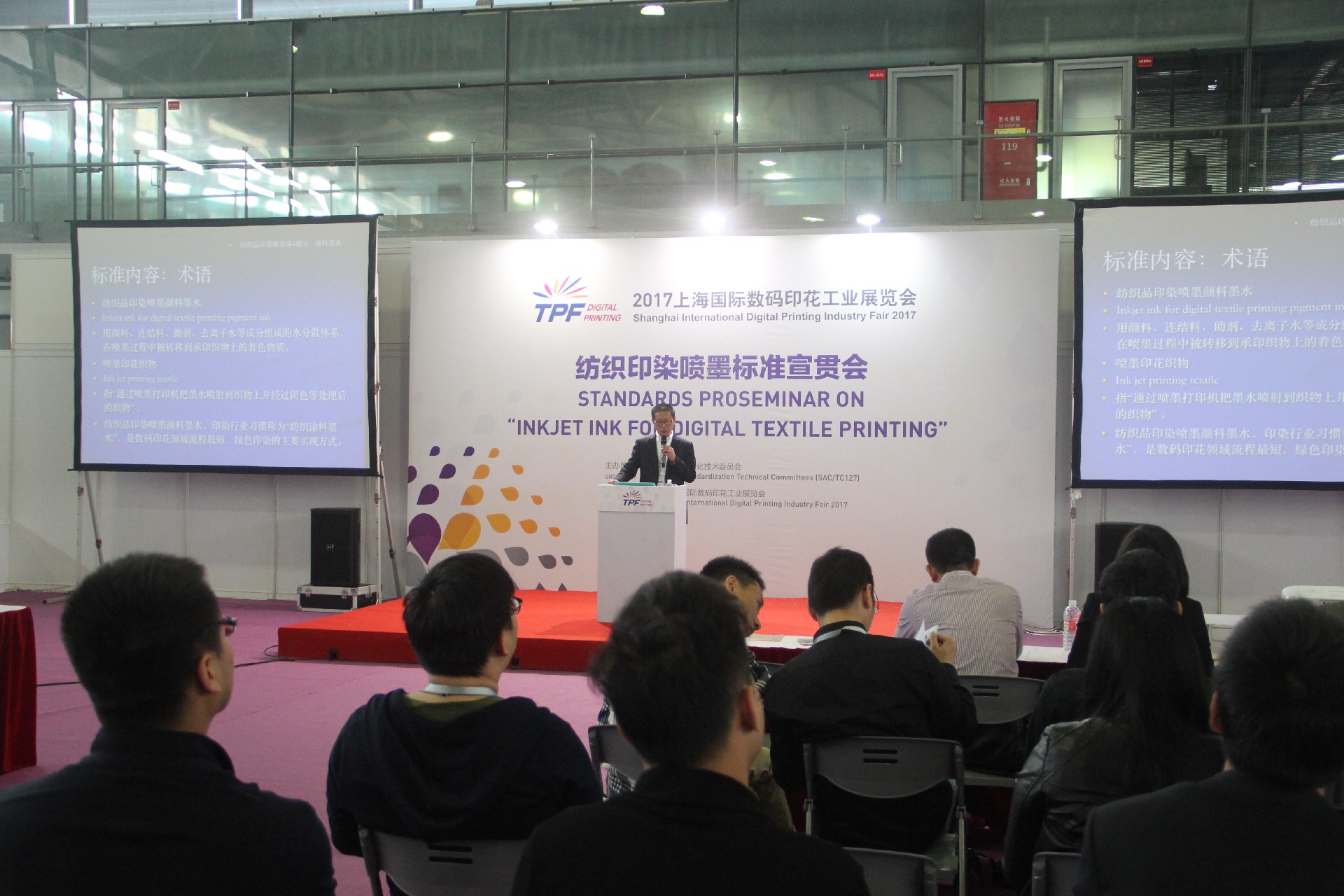 2017年4月20日,紡織品印染噴墨墨水行業標準宣貫會在2017TPF上海數碼印花工業展期間召開。會議由全球油墨標準化技術委員會主辦,上海國際數碼印花工業展覽方支持,主導4項全國紡織品印染噴墨墨水行業標準的第一起草人,分別就2017年1月1日開始實施的噴墨行業紡織印染標準進行解讀。