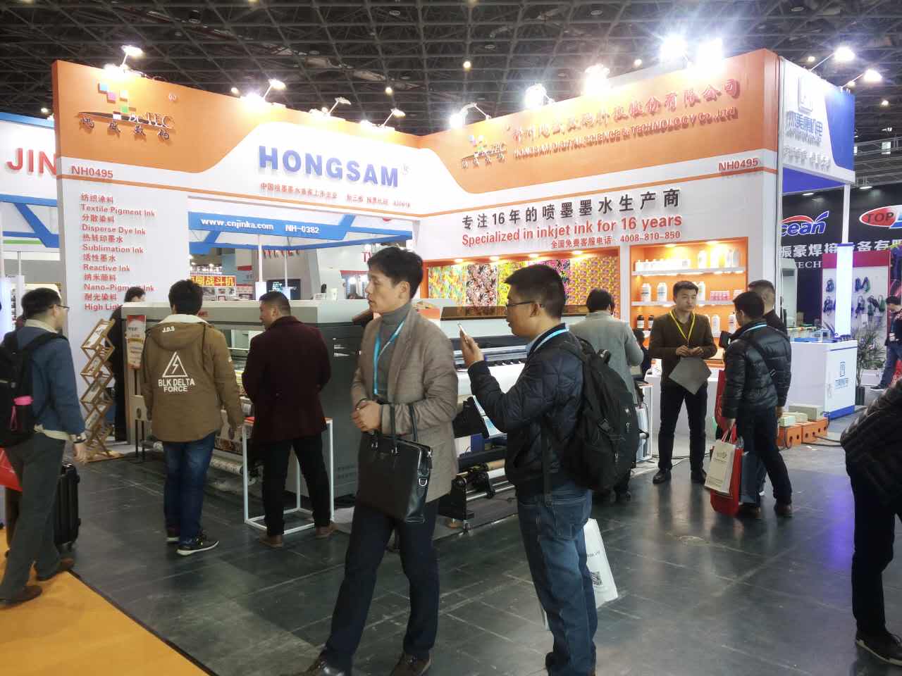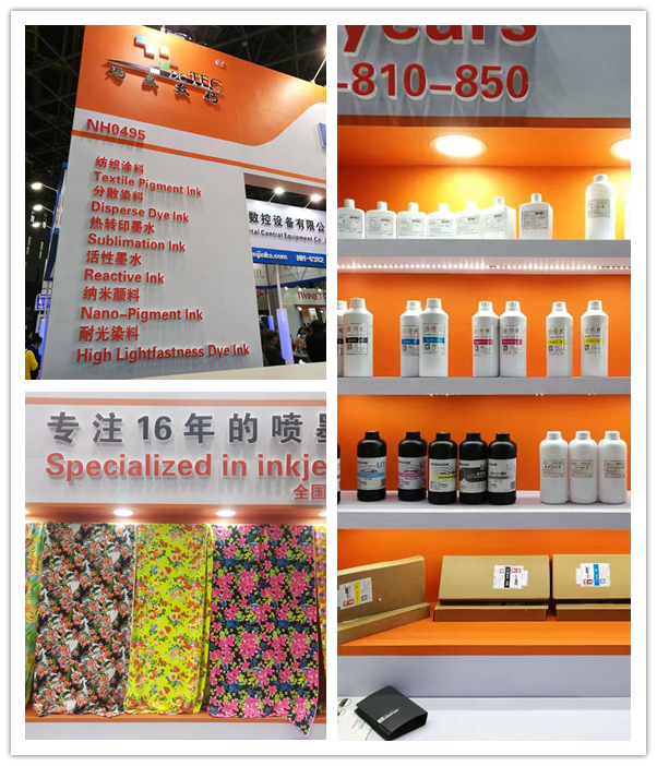 本次展會,鴻盛數碼共攜數碼印花類四大產品亮相現場,分別是:紡織涂料墨水、分散染料墨水、活性染料墨水、酸性染料墨水以及影像類顏料墨水、高耐光染料墨水等,主打的紡織類墨水現場演示讓許多人駐足停留。
