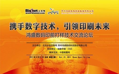由必勝印刷網與鄭州鴻盛數碼科技股份有限公司聯合主辦的“攜手數字技術,引領印刷未來——鴻盛數碼印前打樣技術交流論壇”將于2011年10月21日在北京湖南大廈盛大召開,屆時,來自全國的150多家全國印刷標準化技術委員會會員單位、各省(市)新聞出版局印刷處、印刷品質量監測站、印刷協會、印刷包裝企業、印刷原輔材料供應商、印刷設備供應商、噴墨耗材經銷商等企業將共聚一堂,共同探討數字技術在印刷行業的應用,感受鴻盛數碼數碼打樣方案和藍紙打樣方案的實際效果,共話印刷未來。