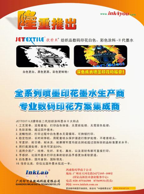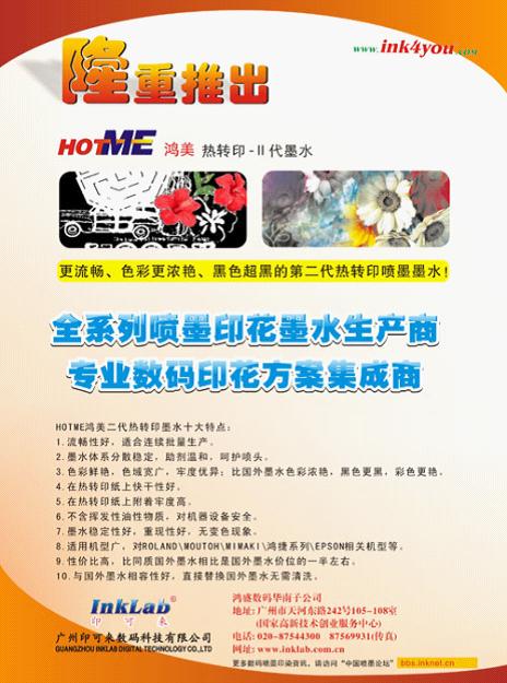 廣州印可來所推介的兩款數碼印花新品:鴻盛數碼二代熱轉印墨水、二代涂料紡織墨水,就是針對目前國內日益壯大的數碼印花市場所推出的新品墨水。據了解,這兩款墨水由鄭州鴻盛數碼有限公司在2011年11月份推出市場,并受到市場專業人士的極大關注。通過推介會我們了解到關于這兩款墨水的一些特點。