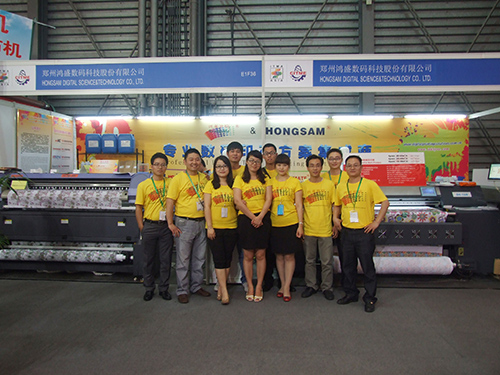 鴻盛數碼全體參展人員身著HONGJET-8420平板式數碼印花機印制的T恤。T恤上的主題圖案用鴻盛“捷特絲II代紡織涂料墨水”直接噴印,工藝簡單,圖案色彩鮮艷,環保耐水洗。