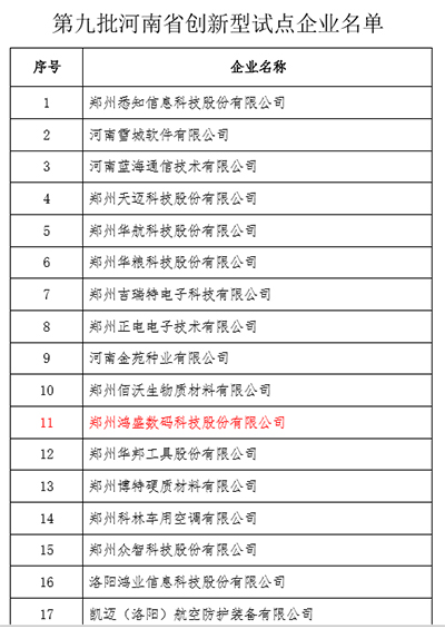 鴻盛數碼2015年11月申報了河南省創新型試點企業,近日,河南科技網公布了評審結果,鴻盛數碼被確定為河南省第九批創新型企業。