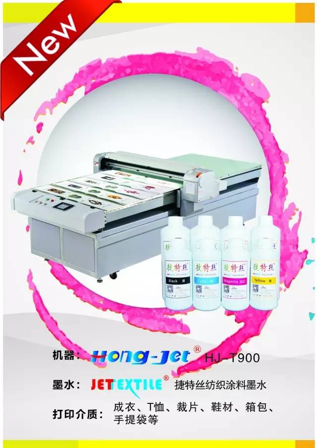 “捷特絲”紡織涂料墨水配合鴻捷全新 HJ-T900 平板數(shù)碼印花機(jī),則具有超大幅寬面板,一次可打多件成衣或裁片,更準(zhǔn)確、更高效、更快速。