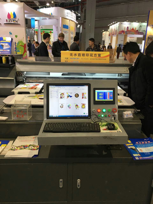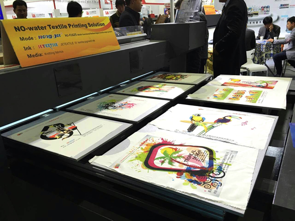 “捷特絲®”紡織涂料墨水適用于幾乎所有面料,可直噴純棉裁片、T恤等印花,工藝簡單,印花后高溫焙烘即是成品,一般不需水洗,沒有污水排放,是真正節(jié)能環(huán)保的紡織品生產(chǎn)模式。鴻盛數(shù)碼使用“捷特絲®”三代紡織涂料墨水在HJ-F1625多功能平板數(shù)碼印花機(jī)展示了涂料墨水的流暢打印,生產(chǎn)過程中幾乎不用清洗,提升了生產(chǎn)效率,獲得了觀眾的高度認(rèn)可。