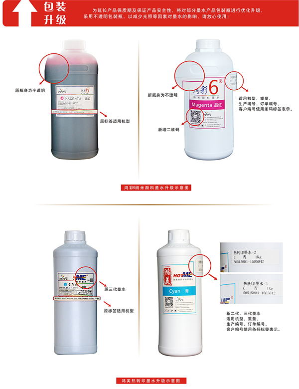 為延長產品保質期及保證產品安全性,將對部分墨水產品包裝瓶進行優化升級,采用不透明包裝瓶,以減少光照等因素對墨水的影響,請放心使用!