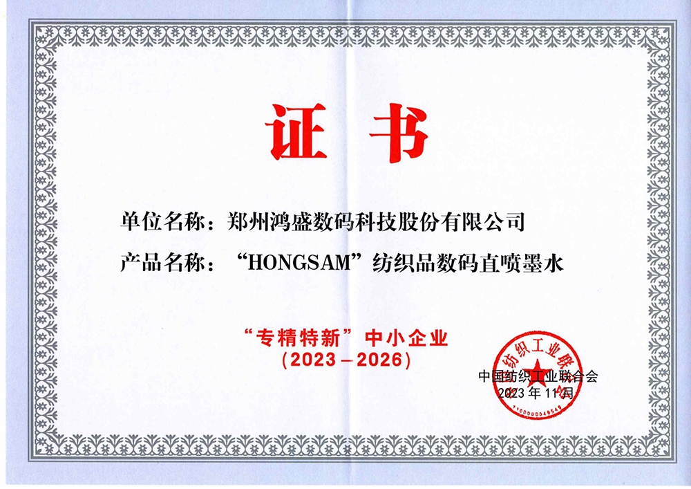 2021年,鴻盛數碼和鄭州大學合作的“數碼噴印墨水制備關鍵技術及其應用”項目榮獲“中國紡織工業聯合會科技進步二等獎”