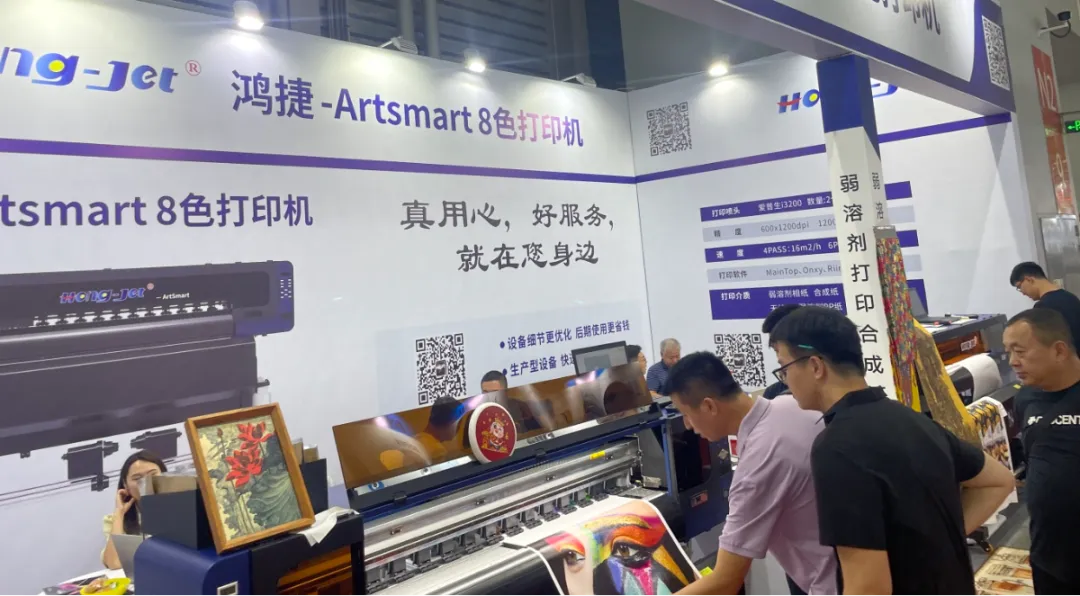 在展會現場,HONGJET-artsmart 8色雙頭數碼打印機憑借其卓越性能脫穎而出,以驚人的快速響應能力、穩定的輸出品質、高精度的打印效果以及成本效益高的特點贏得了廣泛關注。該機型不僅兼容油畫布、高端相紙、銅版紙等多種打印介質,完美滿足不同領域的個性化需求,更以其在速度與質量上的雙重優勢,成為了現場的一大亮點。