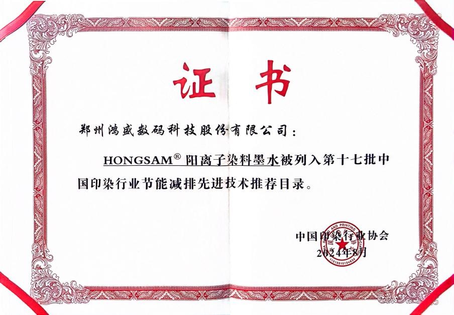 2024年,“HONGSAM®陽離子染料墨水”入選第十七批中國印染行業節能減排先進技術推薦目錄