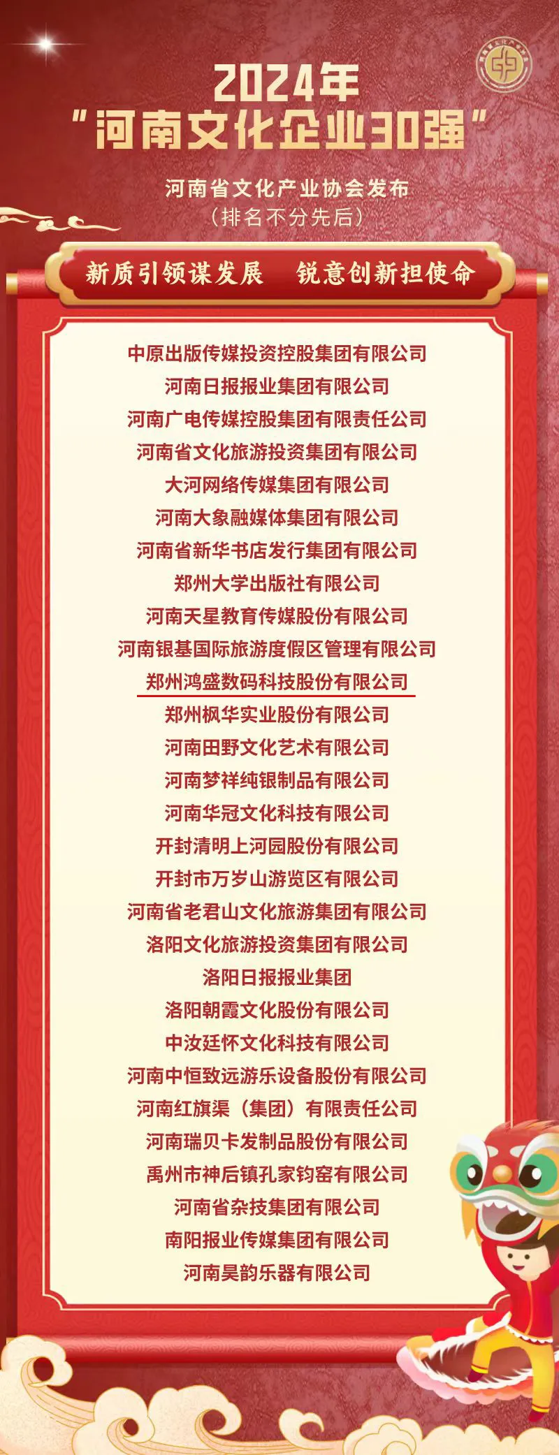 2025年1月9日, “河南文化企業30強”授牌儀式在鄭州市易元深航國際酒店舉行,鴻盛數碼喜獲此殊榮。