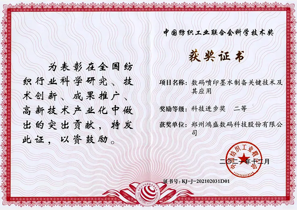 ?2021年,鴻盛數碼和鄭州大學合作的“數碼噴印墨水制備關鍵技術及其應用”項目榮獲“中國紡織工業聯合會科技進步二等獎”