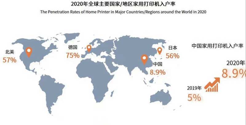據統計,2021年中國打印機市場規模為350億元左右其中家用打印機市場規模為 33.8 億元,比2019 年增長了 1.2倍。而家用打印機在中國的入戶率,也由2019年的5%提升至 2020 的 9%,而歐美日等發達國家,打印機的入戶率在60% 左右,中國的市場潛力還非常大。自全球疫情爆發以來,居家學習辦公時間的延長,帶來了大量課業資料以及辦公文件的打印需求,也慢慢形成了居家打印的習慣,這也將成為中國家用打印機市場增長的主要驅動力。